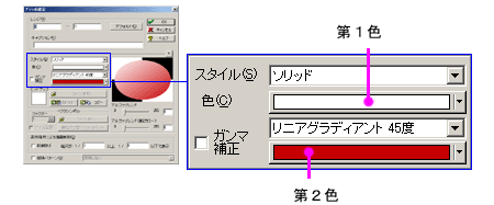 A第1色設定ボタンの下から"リニアグラディアント○○度"を選択し、第2色を設定
